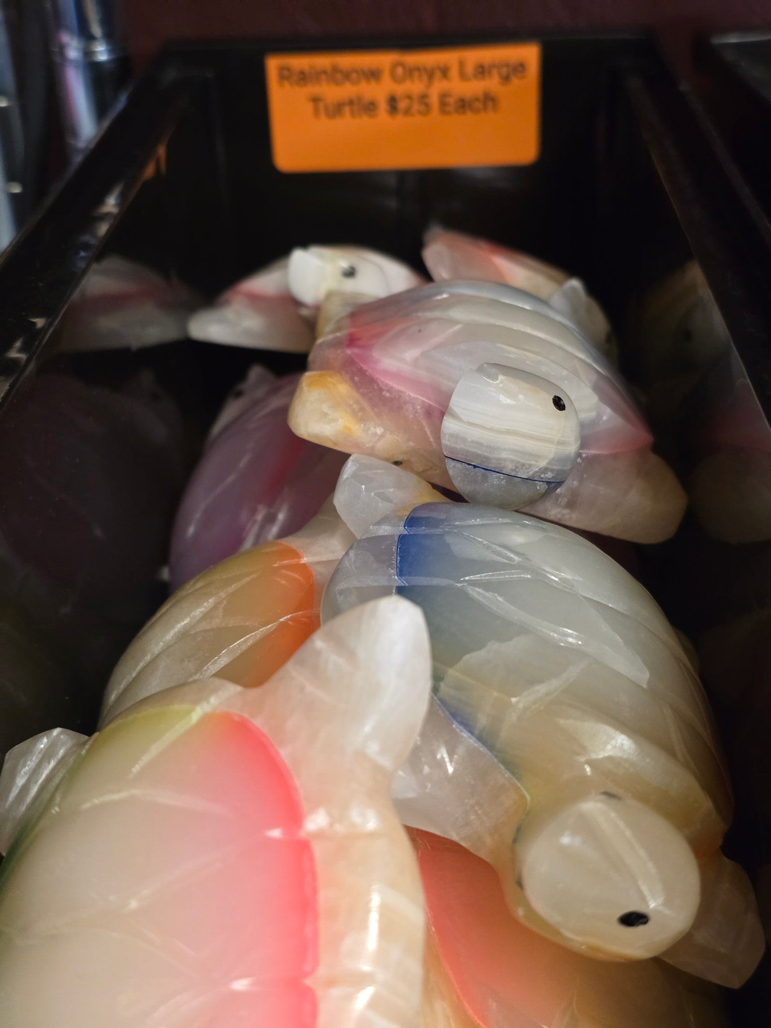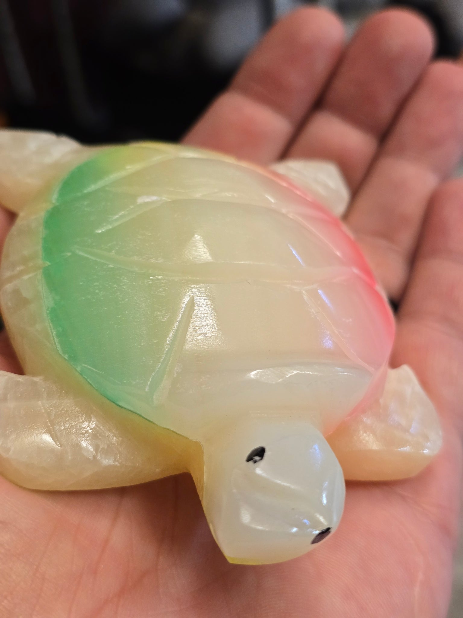 Large Rainbow Onyx color Turtle! Made from Onyx in Pakistan and between the layers of translucent Onyx they place some awesome colorful materials that glow wonderfully under Longwave 365nm Filtered UV. Approximately 4 inches and 10 ounces. Colorful in daylight and uv.