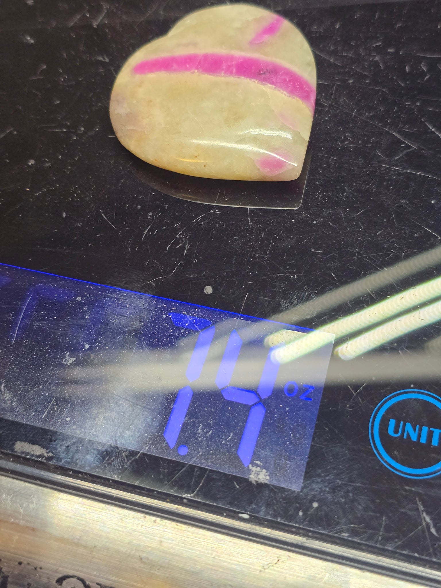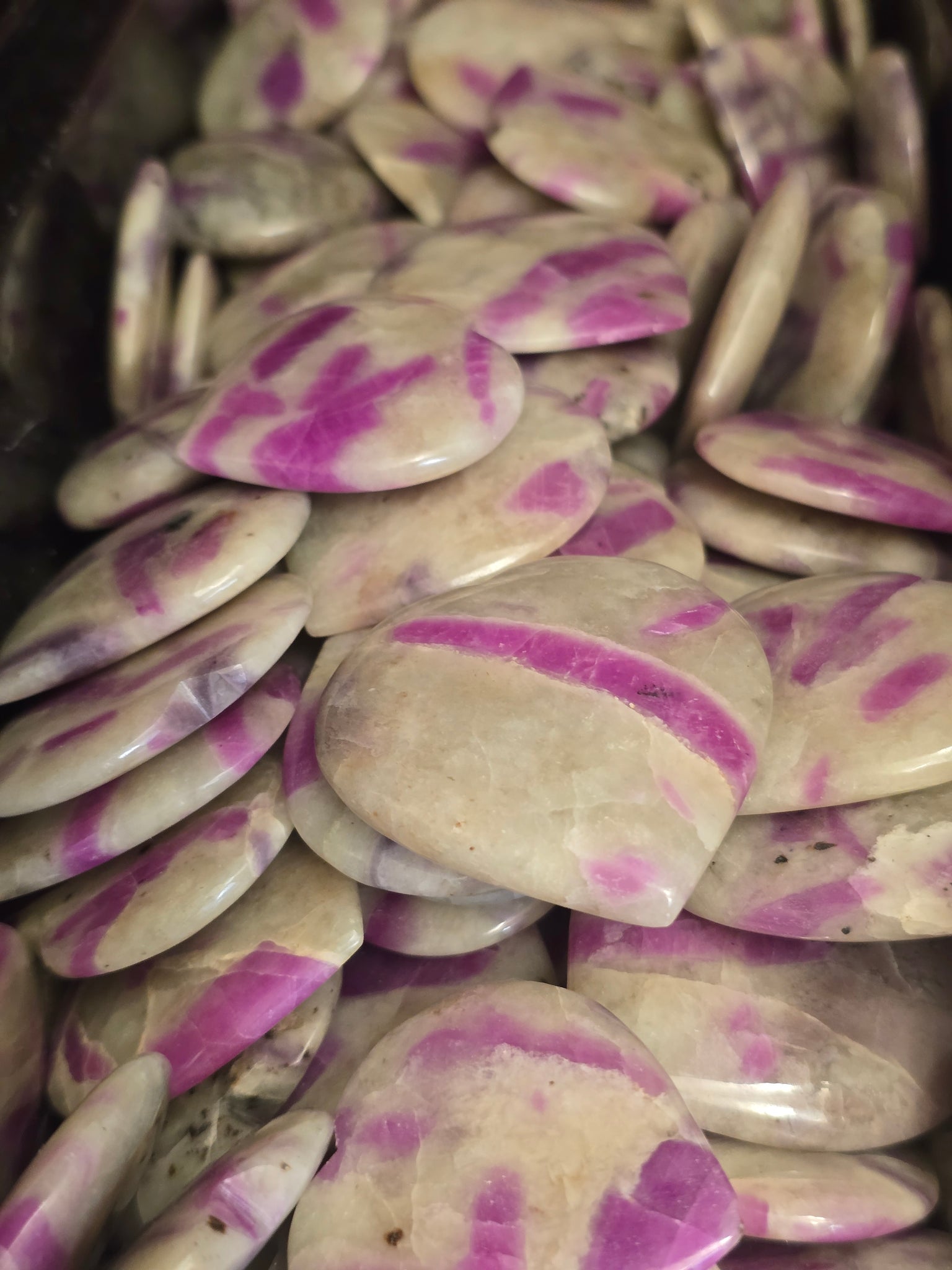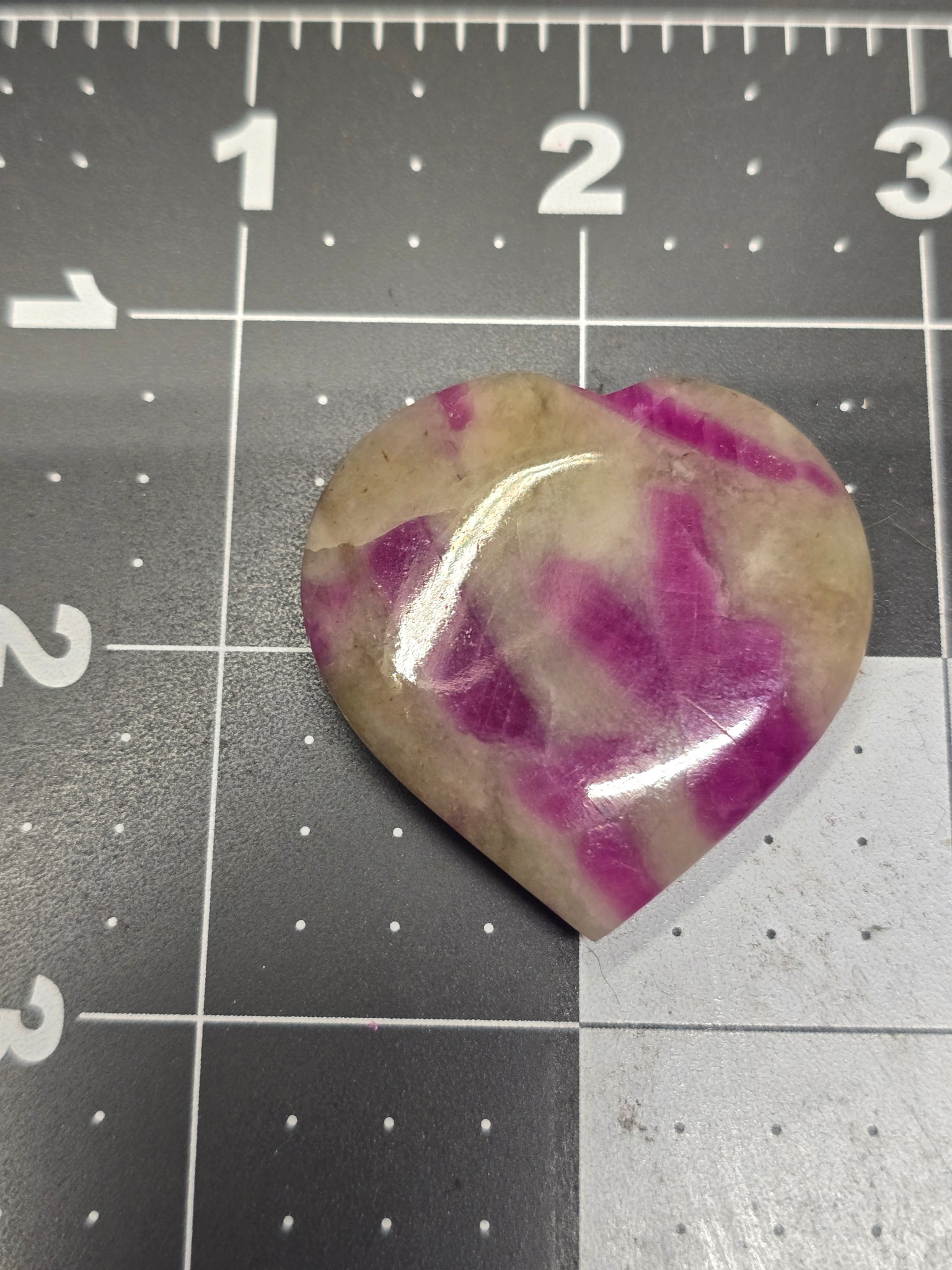 Fluorescent ruby from India. Ruby in Cordurite hearts are great in daylight and magical with lots of fluorescing rubies! Great under Longwave 365nm Filtered UV.