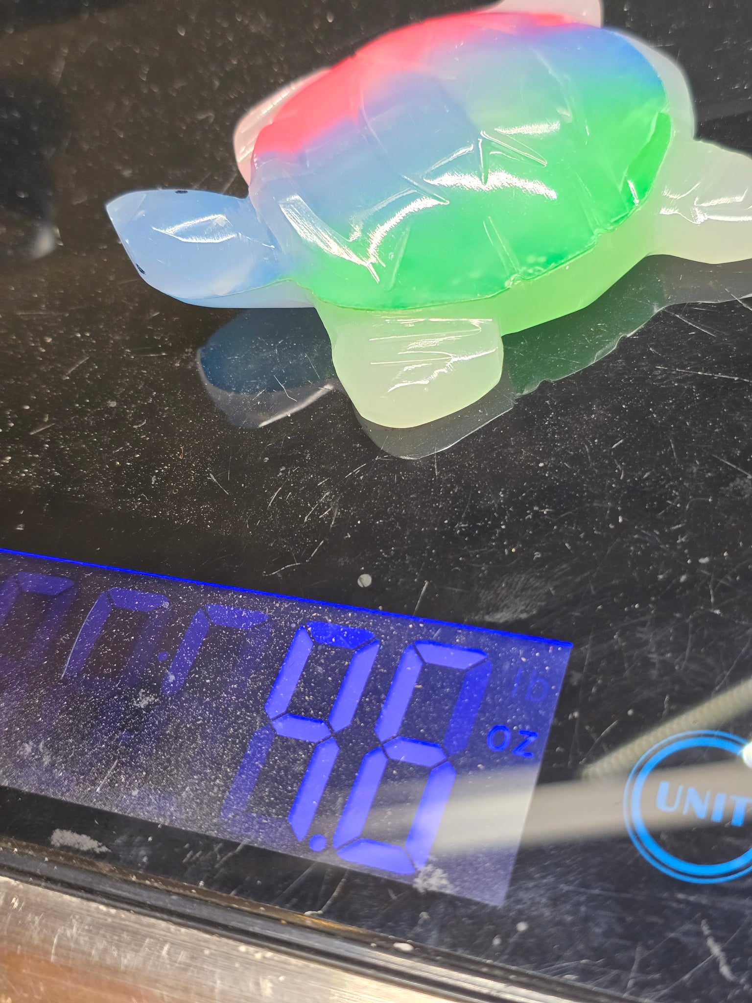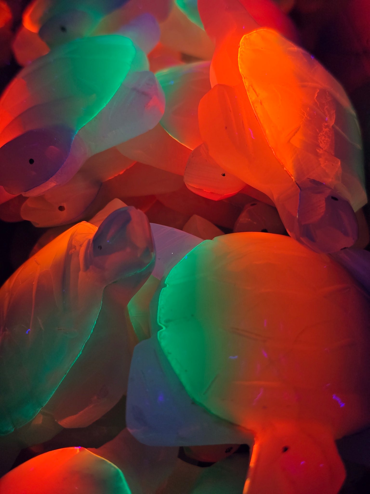 SMALL Rainbow Onyx color Turtle! Made from Onyx in Pakistan and between the layers of translucent Onyx they place some awesome colorful materials that glow wonderfully under Longwave 365nm Filtered UV. Approximately 2 inches and 5 ounces. Colorful in daylight and uv.